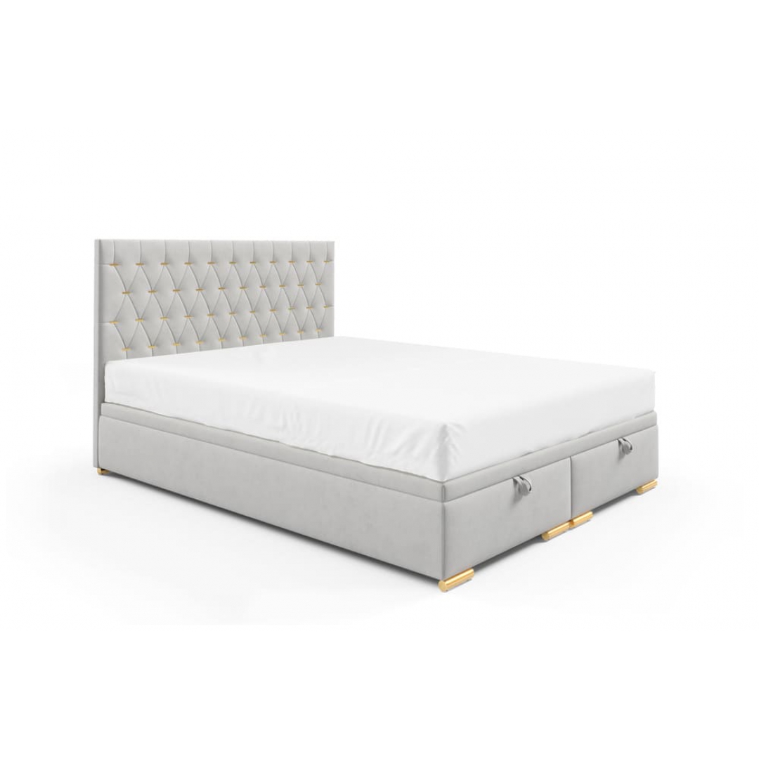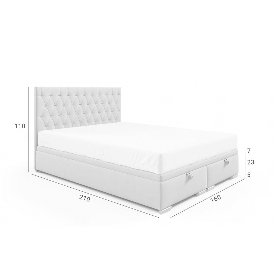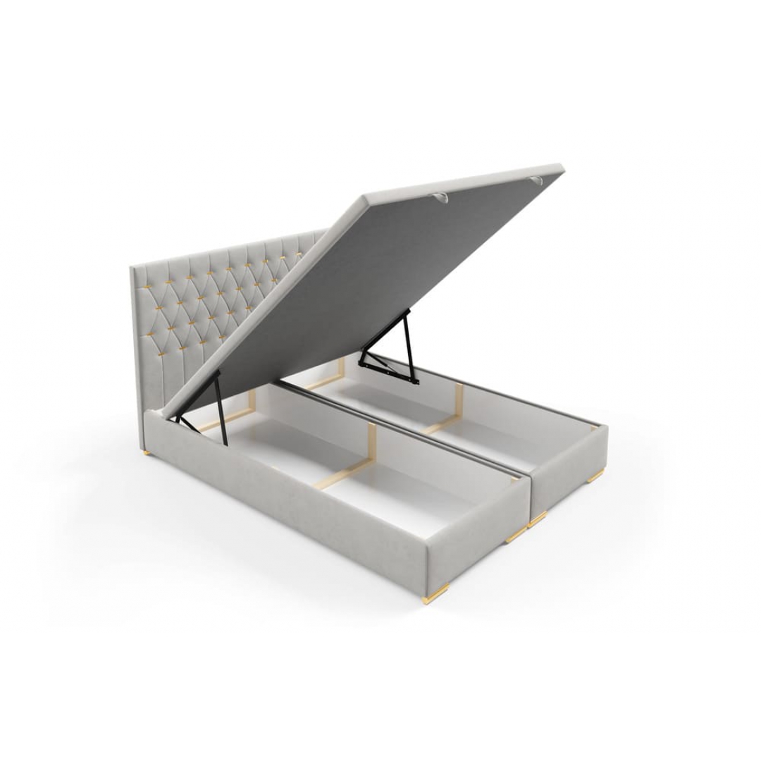 Postelja vključuje visoko oblazinjeno vzglavje, dve praktični skrinji za shranjevanje posteljnine ter lesen okvir, ki se odpre s pomočjo plinskih amortizerjev, kar omogoča preprosto dostopanje do shranjevalnega prostora.