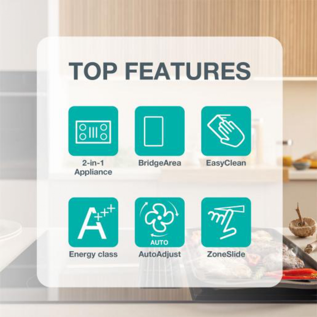 Kuhajte učinkoviteje in brez skrbi z novo funkcijo, ki omogoča sočasen prenos posode, časa in stopnje moči na drugo kuhalno območje. Preprosto premaknite posodo in ustvarite prostor za drugo – uporabite tisto kuhalno cono, ki jo potrebujete.