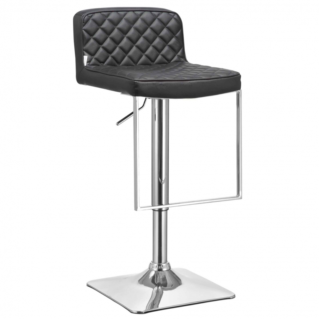 Praktičen barski stol z nastavljivo višino in vrtilno funkcijo, na voljo v povsem črni barvi s kromiranim podnožjem. Sedež ima oblazinjenje iz umetnega PU usnja, prešito z okrasnimi šivi v obliki diamantov. Stol ima za dodatno udobje tudi nizek naslon za hrbet. Podnožje stola je izdelano iz kovine. Stol je opremljen tudi z naslonjalom za noge, za bolj udobno sedenje. Maksimalna nosilnost barskega stola je 120 kg.