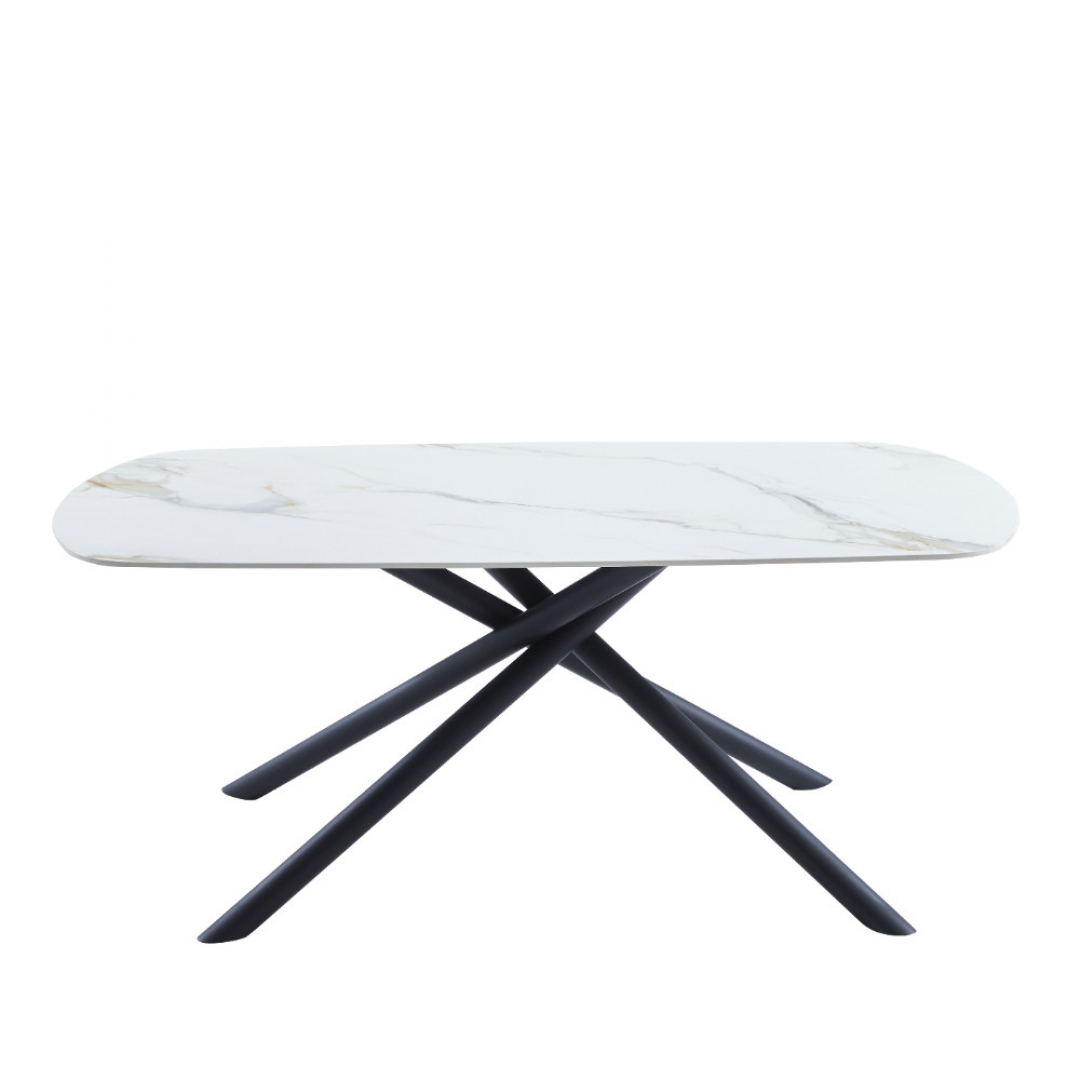 Velika jedilna miza z namizno ploščo iz sintranega kamna in z zaobljenimi robovi. Plošča mize je debeline 12 mm in je izdelana iz sintranega kamna, s čudovitim vzorcem belega marmorja z zlatimi žilami in visokega sijaja. Sintrani kamen je narejen iz kombinacije naravnega kamna v različnih barvah in ima več prednosti pred navadno keramiko. Je močnejši od velikih keramičnih plošč in se ne razbije zlahka. V primerjavi s ploščami iz naravnega granita pa je tudi naravno vodoodporen in okolju prijaznejši od kemično obdelanih kremenčevih plošč. Noge so narejene iz kovinskih cevi in za boljšo zaščito prašno lakirane v črno barvo. Maksimalna nosilnost mize je 120 kg.