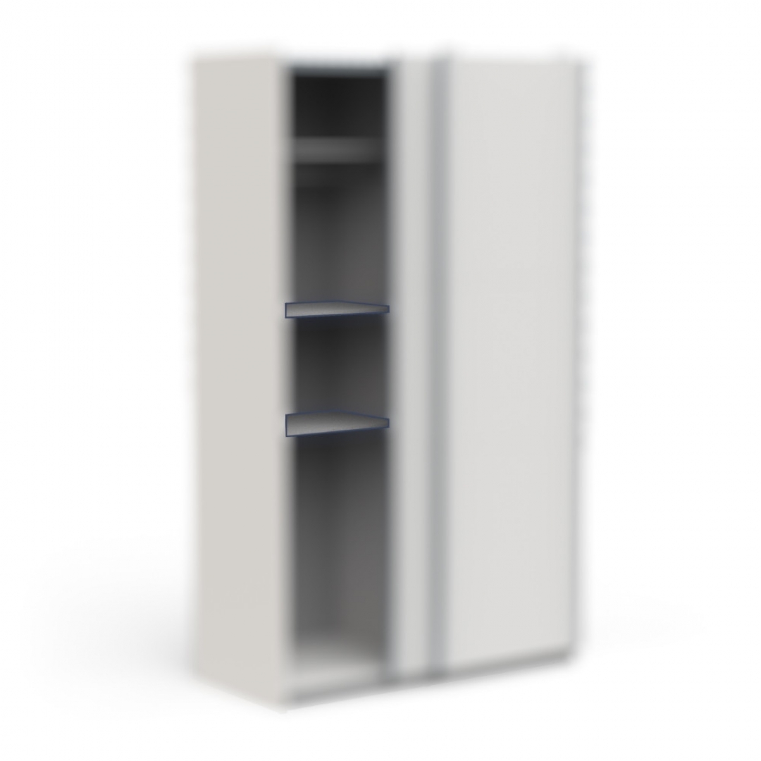 Prostorna notranjost sive barve je razdeljena na dvoje s fiksno pregrado. V zgornjem delu garderobe sta dve fiksni polici in dve letvi za obešanje oblačil. Police lahko nosijo do 12 kg, letve pa do 18 kg. Vrhnja plošča omare lahko prenese do 33 kg.