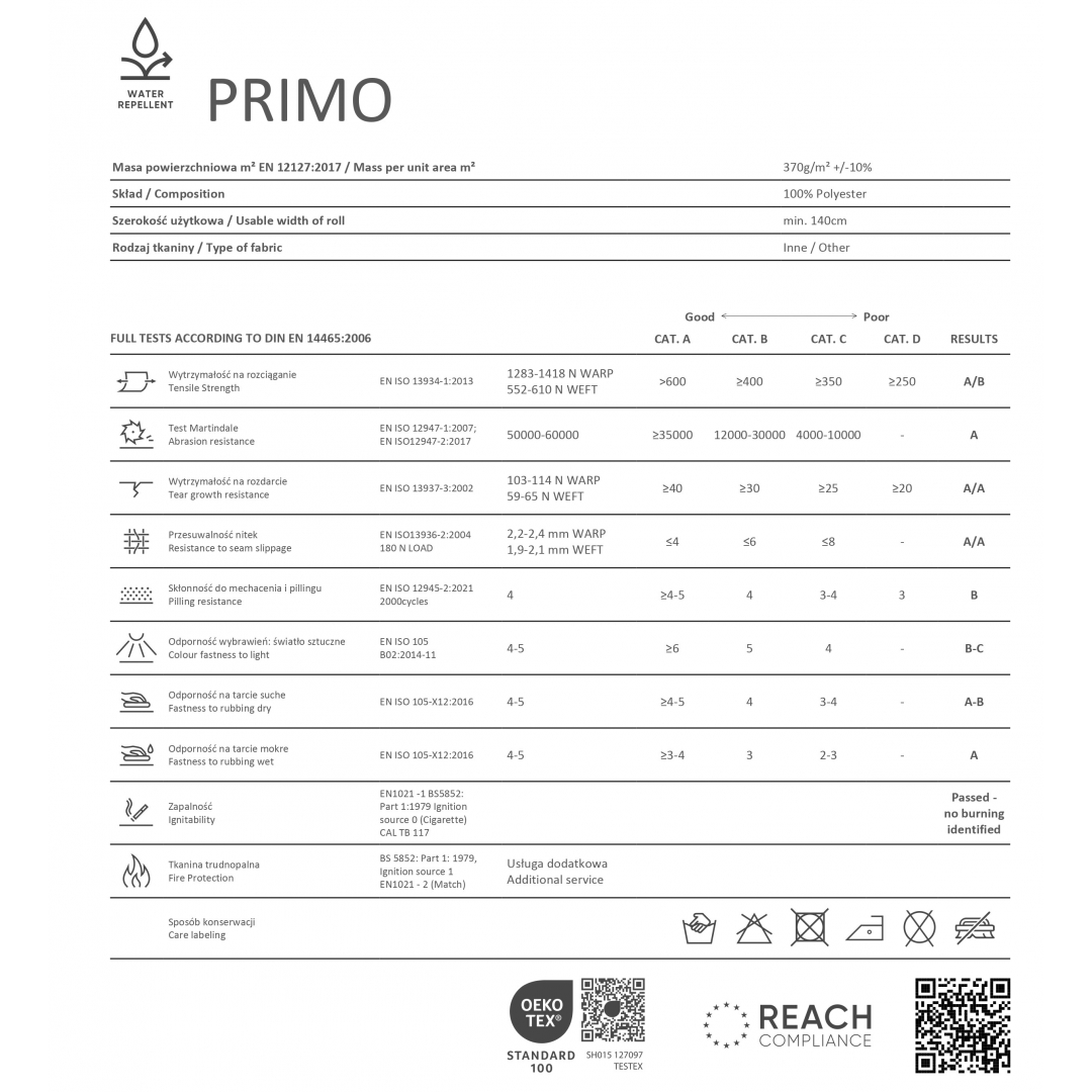 Sedežna garnitura v obliki črke L, oblazinjena z mehko, visokokakovostno tkanino v sivi barvi ter na voljo v levi ali v desni varijanti. Tkanina je popolnoma vodoodporna, skladna z evropsko direktivo REACH glede kemikalij, izdelana iz 100% poliestra, s povprečno gostoto 370g/m².
