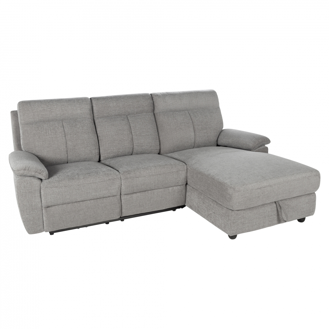 Udobna sedežna garnitura, opremljena s počivalnikom ter pokrito skrinjo za shranjevanje. Oblazinjena je z mehko in trpežno tkanino v svetlo sivi barvi, ki se dobro prilega široki paleti notranjih slogov. Debelo oblazinjeno hrbtišče ter rokonasloni zagotavljajo izjemno udobje ter sprostitev tudi ob vsakodnevni uporabi.