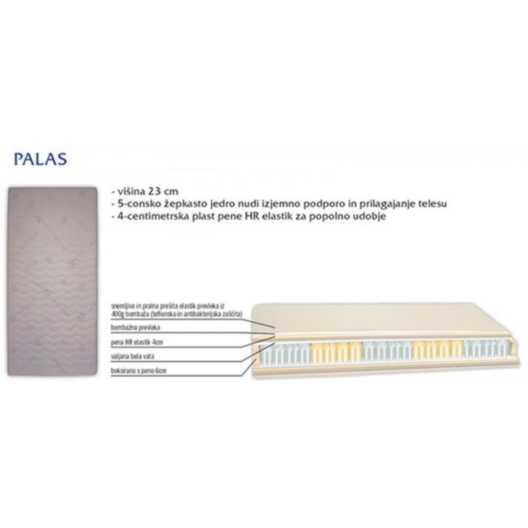 Vzmetnica PALAS s 5 conskim vzmetenjem se izjemno prilagaja vašemu telesu in vaši hrbtenici omogoča pravilno lego. Vzmetnica je zračna in izdelana iz kvalitetne HR pene, ki zagotavlja popolno udobje. Vsebuje tudi BOX, ki onemogoča udiranje in odpravlja občutek drsenja.