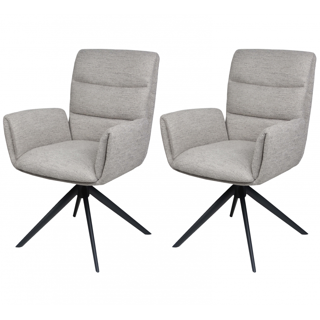 Oblazinjen jedilniški stol z rokonasloni ter vrtilno funkcijo, ki združuje sodoben slog s funkcionalno uporabnostjo, primeren za širok spekter stanovanjskih in poslovnih notranjosti.