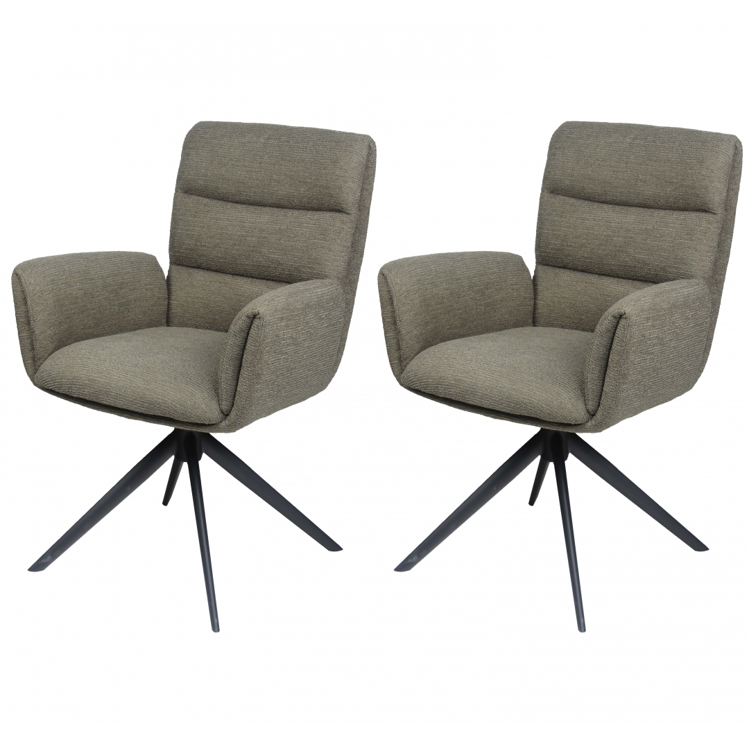 Oblazinjen jedilniški stol z rokonasloni ter vrtilno funkcijo, ki združuje sodoben slog s funkcionalno uporabnostjo, primeren za širok spekter stanovanjskih in poslovnih notranjosti.